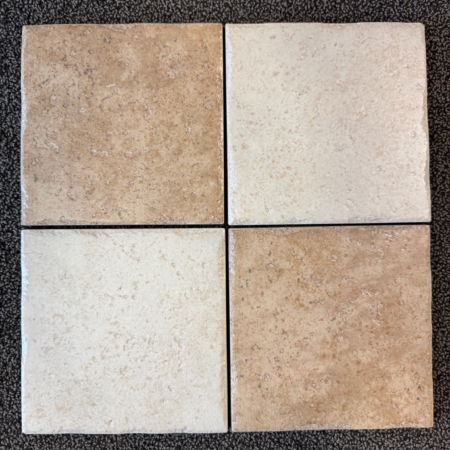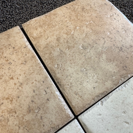 Leuke mozaiekvloer in warmgrijze kleur met getrommelde kanten die beige oplichten. Voor een mooie antieke look.